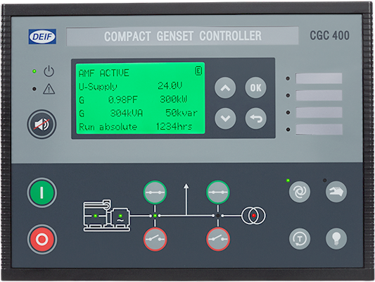 The compact genset controller (CGC 400) is based on standard advanced software of multi-line 2. The compact genset controller (CGC 400) cantains all necessary 3-phase measuring circuits, and all the values and alarms are presented on the LCD display. The CGC 400 will come in two different versions CGC 412 and CGC 413.